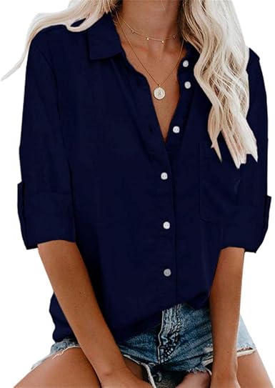 Ours Women Casual V Neck Button Up Shirts Loose Cuffed Sleeve Blouse Tops With Pockets At Amazon Women S Clothing Store